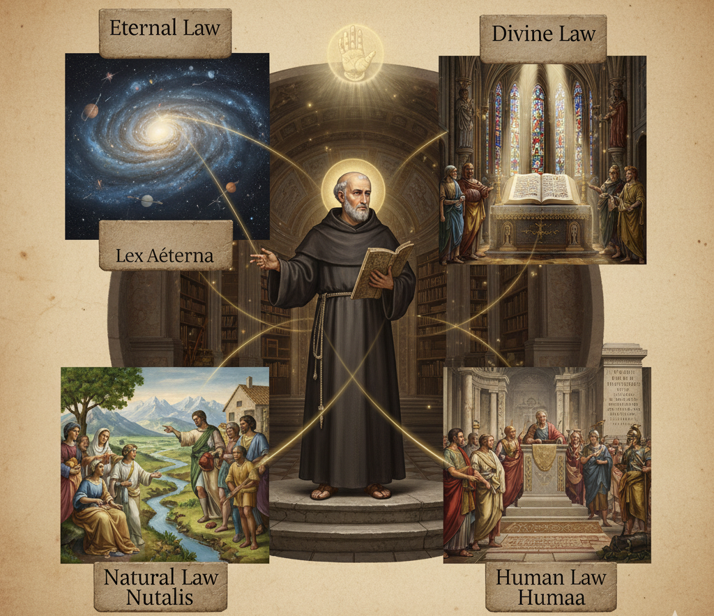 아퀴나스는 인간 사회의 질서를 법이라는 개념으로 체계화했습니다. 그는 법을 위계질서에 따라 네 종류로 나누었습니다. 첫째, 영원법. 가장 높은 법입니다. 이것은 신의 마음속에 있는 우주 전체의 질서이자 계획입니다. 우주를 다스리는 신의 이성 그 자체입니다. 오직 신만이 이 법을 완전히 알 수 있습니다. 둘째, 자연법. 영원법 중에서, 인간이 자신의 이성을 통해 파악할 수 있는 부분입니다. 자연법의 제1 원리는 "선을 행하고 악을 피하라"는 것입니다. 인간은 누구나 이성을 통해 생명을 보존하고, 진리를 찾으며 살아야 한다는 보편적인 도덕 원리를 알 수 있습니다. 셋째, 인간법. 각 국가나 사회가 만든 구체적인 실정법입니다. 자연법의 원리를 현실에 적용한 것입니다. 예를 들어, "살인하지 말라"는 자연법입니다. 이것을 "살인한 자는 사형에 처한다"처럼 구체적인 법으로 만든 것이 인간법입니다. 만약 인간법이 자연법에 어긋난다면, 그것은 올바른 법이 아닙니다. 다섯째, 신법. 인간의 이성만으로는 알 수 없는 법입니다. 신이 성경 등을 통해 직접 계시해 준 법입니다. 십계명이나 예수의 가르침이 여기에 속합니다. 신법은 자연법이 부족한 부분을 보충해주며, 인간을 궁극적인 행복으로 이끌어 줍니다. 이 네 가지 법의 체계는 아퀴나스가 만든 위대한 설계도입니다. 신의 질서와 인간의 질서가 어떻게 완벽하게 연결되는지를 명확하게 보여줍니다.