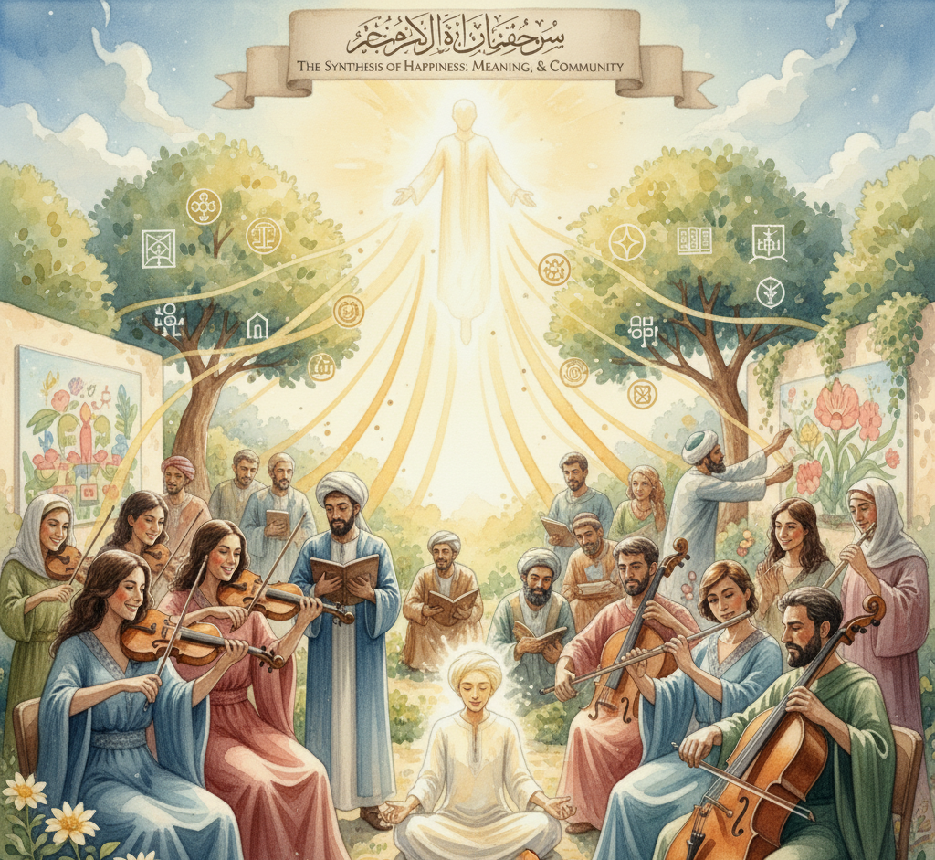 알파라비는 행복이 혼자 이룰 수 있는 것이 아니라고 강조했습니다. 그는 이상국가라는 완벽한 공동체를 꿈꿨습니다. 이것은 마치 최고의 학교와 같습니다. 가장 훌륭한 교장 선생님(철학자 왕)이 있습니다. 교장 선생님은 학생들(시민)이 지식을 암기하는 것이 아니라 올바른 인격(덕)을 갖추도록 이끕니다. 시민들은 그 안에서 서로 도우며 함께 성장합니다. 알파라비에게 철학자는 책상에 앉아 사색만 하는 사람이 아닙니다. 시민들의 인격을 이끌고 행복을 설계하는 스승'이자 가이드입니다. 그는 종교적인 실천만으로는 완전한 행복에 이를 수 없다고 보았습니다. 이성, 도덕, 그리고 이 모든 것을 뒷받침하는 건강한 공동체가 함께 있어야만 했습니다.