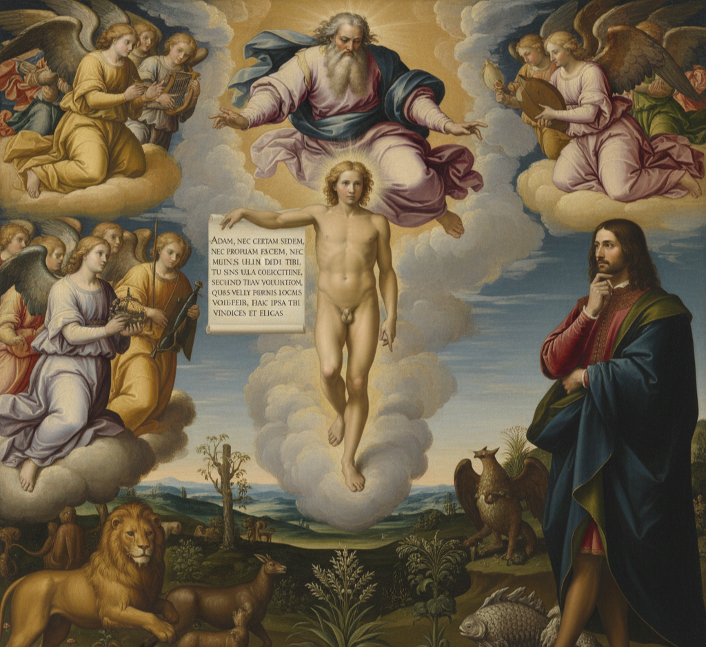 "아담아 너에게는 정해진 거처도, 고유한 모습도, 정해진 임무도 주지 않았다. 너는 그 어떤 것에도 구속받지 않는다. 너는 너 자신의 자유로운 의지에 따라 너 자신이 원하는 모습과 임무를 스스로 결정할 것이다."