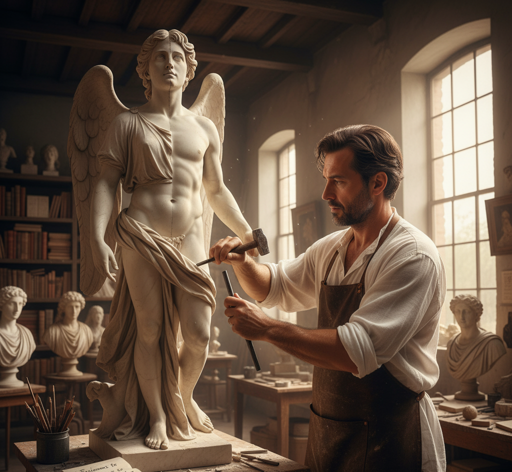 피코는 이어서 신이 인간에게 한 가장 유명한 말을 상상해 냅니다. 이 문장은 그의 철학을 가장 잘 요약해 줍니다. 너는 스스로의 조각가이다. 너는 스스로를 짐승으로도 천사로도 만들 수 있다. 정말 가슴 뛰는 말이지 않습니까? 피코는 인간을 조각가에 비유했습니다. 신은 우리에게 자유 의지라는 망치와 정을 쥐여 주었습니다. 그리고 우리 자신의 삶이라는 대리석을 주었습니다. 이제 선택은 우리의 몫입니다. 만약 우리가 감각적 쾌락과 본능만을 따른다면 우리는 자신을 짐승의 모습으로 조각할 것입니다. 반대로, 우리가 이성을 따르고 더 높은 가치를 추구하며 수양한다면 우리는 자신을 천사나 신과 같은 고귀한 모습으로 빚어낼 것입니다.
