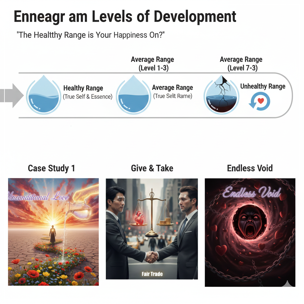 사람들은 흔히 이런 질문을 합니다. 에니어그램 몇 번 유형이세요? 에니어그램(Enneagram)은 그리스어에서 유래했습니다. 에니어(Ennea)는 숫자 아홉(nine)을 뜻합니다. 그라모스(Grammos)는 도형 또는 점(point)을 의미합니다. 즉, 에니어그램은 아홉 개의 점으로 이루어진 도형이라는 뜻입니다. 에니어그램은 사람의 성격을 아홉 가지 유형으로 분류하는 심리 도구입니다. 우리가 어떻게 스트레스를 받고 성장하는지도 보여줍니다. 자신과 타인을 이해하는 데 많은 도움이 되는 성격 진단 도구입니다. 그런데 에니어그램은 성격 유형뿐만 아니라 마음의 수준도 알려 줍니다. 지금 진단을 받는 사람의 마음 수준이 건강한지, 불건강한지, 보통 수준인지를 알려 주는 것입니다. 이를 마음의 발달 수준(Levels of Development)이라고 합니다. 같은 성격이라도 발달 수준에 따라 천사가 되기도 하고 악마가 되기도 합니다.
