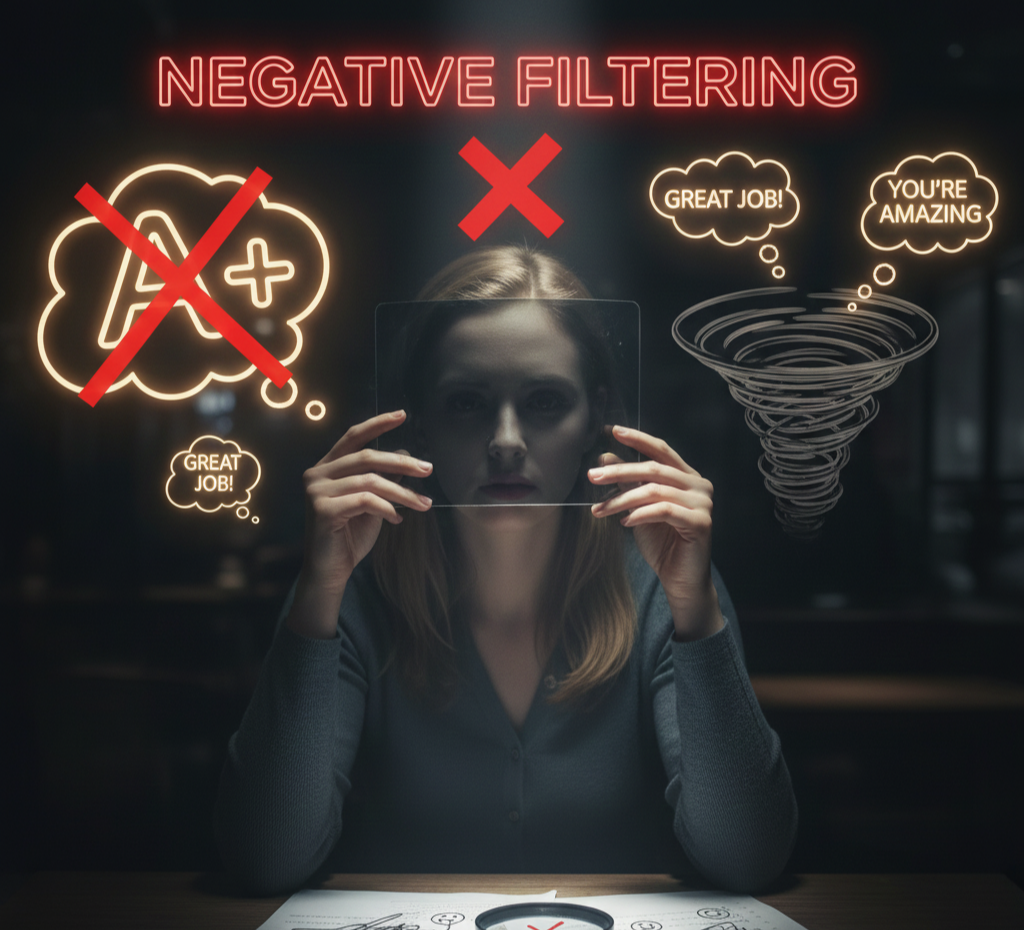 부정적 필터링은 긍정적이거나 중립적인 측면은 모두 걸러내고, 오직 부정적인 부분만 확대하여 인식하는 사고방식입니다. 마치 사진 필터처럼 세상의 모든 밝은 색깔을 제거하고 어두운 색깔만 남기는 것과 같습니다. 좋은 일이 99가지 있었어도 단 한 가지 나쁜 일에만 집중하여 전체를 부정적으로 판단합니다. 보고서에 대한 상사의 긍정적인 평가 5가지는 무시하고, 수정이 필요하다고 지적한 단 한 줄의 내용에만 집착합니다. 결국 내 보고서는 엉망이었구나 라고 결론짓습니다. 즐겁게 파티를 즐겼음에도 불구하고, 자신이 실수로 컵을 엎지를 뻔했던 작은 순간에만 집중하며, 사람들이 나를 바보같이 생각했을 거야 라고 괴로워합니다.