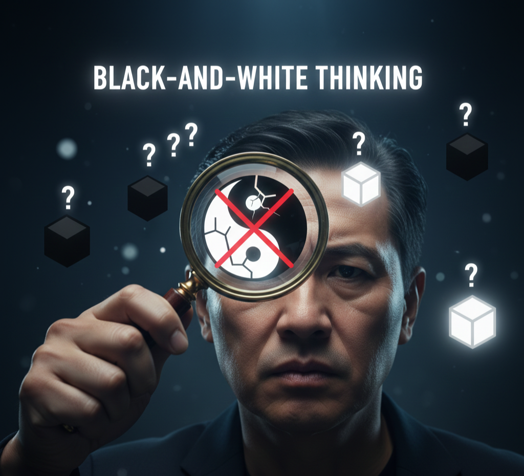 세상을 모두 아니면 전무(All or Nothing)로만 판단하는 사고방식입니다. 회색 지대나 중간 영역은 존재하지 않습니다. 모든 것을 완벽한 성공 아니면 완전한 실패로만 구분합니다. 예를 들어, 시험에서 만점을 받지 못하면 스스로를 완벽한 실패자라고 단정 짓는 것입니다. 작은 실수 하나가 자신의 전체 노력을 무가치하게 만든다고 느낍니다. 이 사고는 유연성이 없고, 자신이나 타인에게 가혹한 기준을 적용하여 결국 모든 일에 대한 부담감을 극도로 높입니다. 이들은 어제 저녁에 케이크 한 조각을 먹었으니, 다이어트는 완전히 망쳤다. 이제 다이어트는 포기하자라고 생각합니다. 저 친구는 저런 생각을 가지고 있으니 나쁜 사람이다 같은 사고입니다.