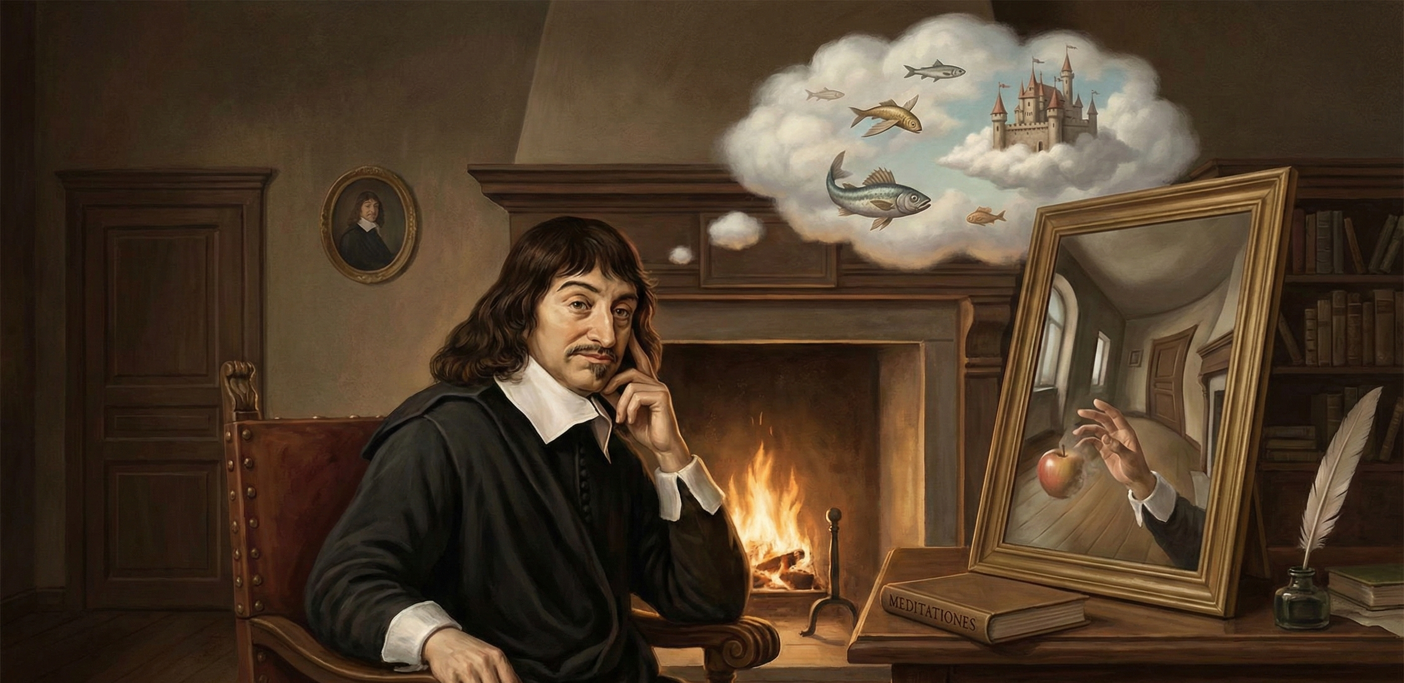안녕, 난 르네 데카르트야. 지금 따뜻한 난로 앞에 앉아 생각에 잠겼어. 그런데 말이야. 문득 우리가 학교나 책에서 배운 지식이 다 모래성 같다는 생각이 들지 뭐야? 선생님마다 말이 다르고 책마다 주장도 제각각이잖아. 그래서 난 내 머릿속의 낡은 집을 싹 부수고 처음부터 다시 짓기로 결심했다. 방법은 간단해. 조금이라도 의심스러운 건 다 가짜라고 치는 거야. 방법적 회의라고나 할까? 자, 나랑 같이 의심의 여행을 떠나볼래? 좀 위험하지만 짜릿할 거야.