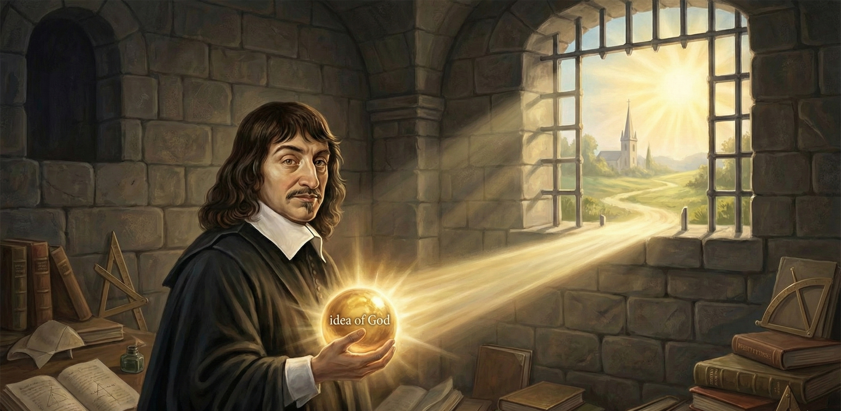 난 생각하는 존재라는 건 알았어. 하지만 나 혼자론 부족해. 가만 보니 내 머릿속엔 완벽한 신에 대한 생각이 있더라. 나처럼 불완전한 인간이 어떻게 완벽을 떠올렸을까? 이건 진짜 완벽한 신이 내게 심어준 게 분명해. 신은 완벽하니까 거짓말쟁이 일 리가 없지. 그러니 신이 만든 이 세상도 가짜가 아니야. 우린 드디어 의심의 터널을 뚫고 진짜 세상을 되찾은 거다.