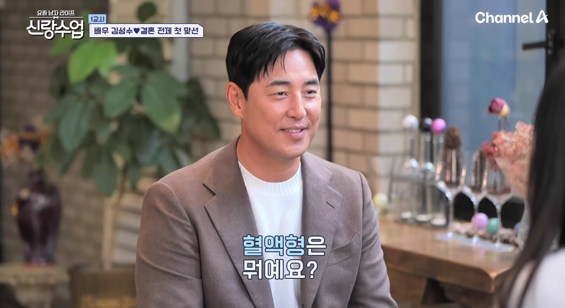 배우 김성수의 신랑수업(채널A)입니다. 김성수씨가 맞선을 보고 있습니다. 그는 여성에게 혈액형을 물어봅니다. 여성은 답하면서 김성수씨의 혈액형을 물어 보네요. 서로 MBTI 유형도 밝힙니다. 두분 모두 B형이고, 김성수씨는 ISFJ, 여성 분은 INFP였습니다. 혈액형과 MBTI 성격 유형이 유사해 보이나요?