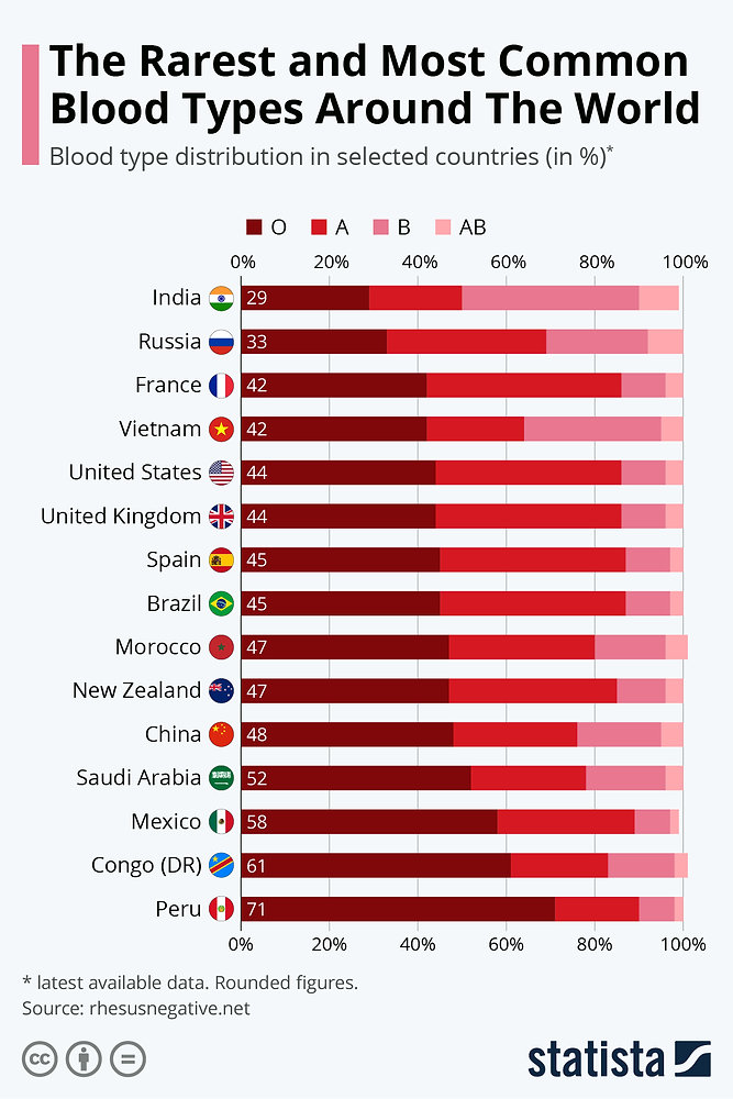 혈액형 성격설이 왜 과학적 근거가 없는지 전 세계 인구 통계를 보면 명확해집니다. 먼저 우리나라의 통계입니다. A형(약 34%), O형(약 28%), B형(약 27%), AB형(약 11%)로 비교적 분포가 고릅니다. 4가지 유형의 사람이 섞여 사니 서로 비교하는 재미가 있습니다. 하지만 시선을 남미로 돌려보면 이야기가 달라집니다. 페루의 원주민들은 O형이 100%에 가깝습니다. 브라질이나 다른 중남미 국가들도 O형이 압도적으로 많습니다. 혈액형 이론대로라면 남미 사람들은 전 국민이 타고난 리더이거나 사교적인 성격이어야 합니다. 그 나라에는 소심한 사람이나 다혈질인 사람이 아예 없어야 합니다. 말이 되지 않습니다.