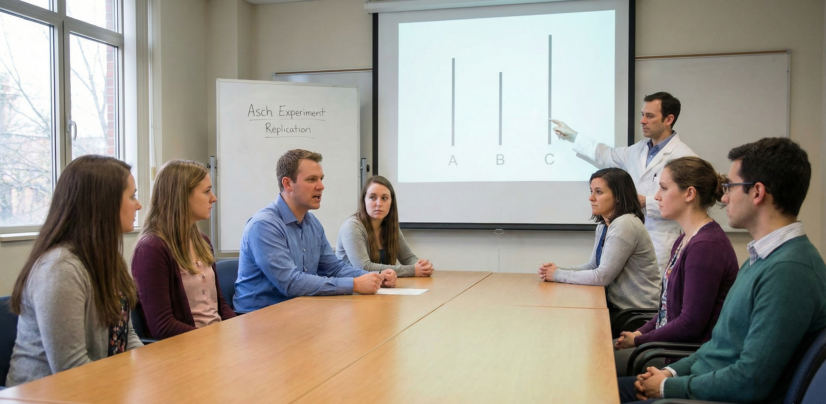 솔로몬 애쉬(Solomon Asch, 1907~1996)는 동조 실험으로 인간의 나약함을 확인하고 싶었던 것이 아닙니다. 그는 다음에 실험 조건을 살짝 바꿔보았습니다. 그리고 거기서 놀라운 희망을 발견했습니다. 기존 실험과 똑같이 7명이 앉아 있습니다. 그런데 이번에는 앞선 6명의 가짜 참가자 중, 딱 한 명에게 진실을 말하게 시켰습니다. 나머지 5명은 여전히 오답(A)을 말하는 데 중간에 한 명이 정답(C)을 말하는 상황입니다. 과연 진짜 참가자의 반응은 어떻게 달라졌을까요?