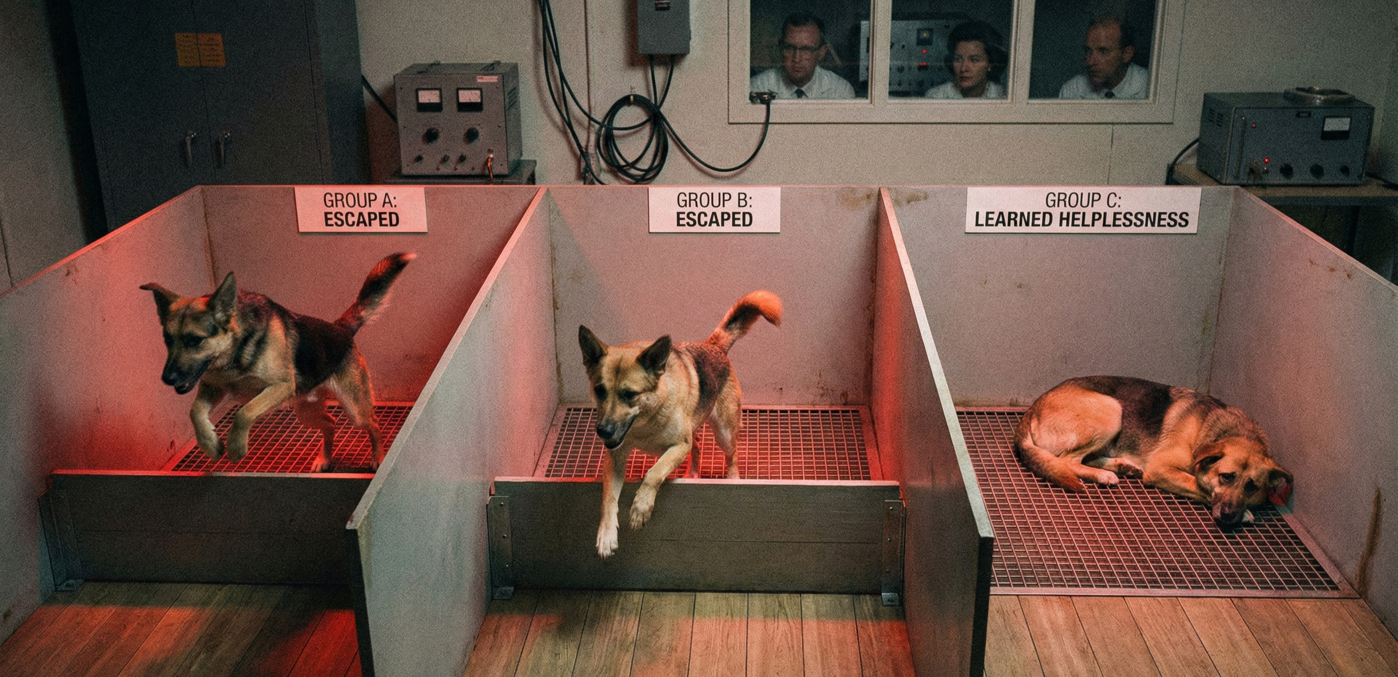 하지만 C 그룹의 개들은 충격적이었습니다. 그들은 도망칠 수 있는 열린 공간이 있는데도, 그저 바닥에 엎드려 낑낑대며 전기 충격을 온몸으로 받아냈습니다. 도망치려는 시도조차 하지 않았습니다. 그들은 무기력을 학습한 것입니다.