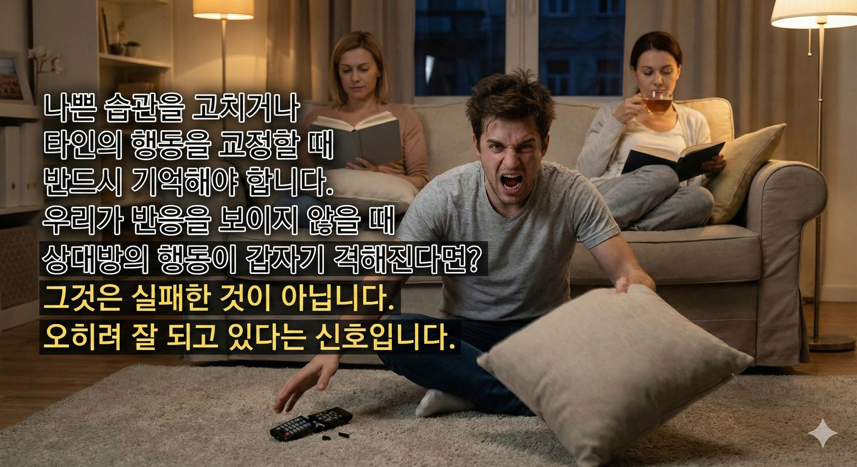 나쁜 습관을 고치거나 타인의 행동을 교정할 때 반드시 기억해야 합니다. 우리가 반응을 보이지 않을 때 상대방의 행동이 갑자기 격해진다면? 그것은 실패한 것이 아닙니다. 오히려 잘 되고 있다는 신호입니다. 행동이 사라지기 직전, 마지막 에너지를 쏟아붓는 단계이기 때문입니다. 이때가 가장 중요합니다. 버텨야 합니다. 자판기를 발로 차도 음료수가 안 나오면 결국 포기하고 돌아섭니다. 아이도 마찬가지입니다. 아무리 소리를 질러도 통하지 않는다는 것을 확인하는 순간에 그 행동은 급격히 줄어들다가 사라집니다.