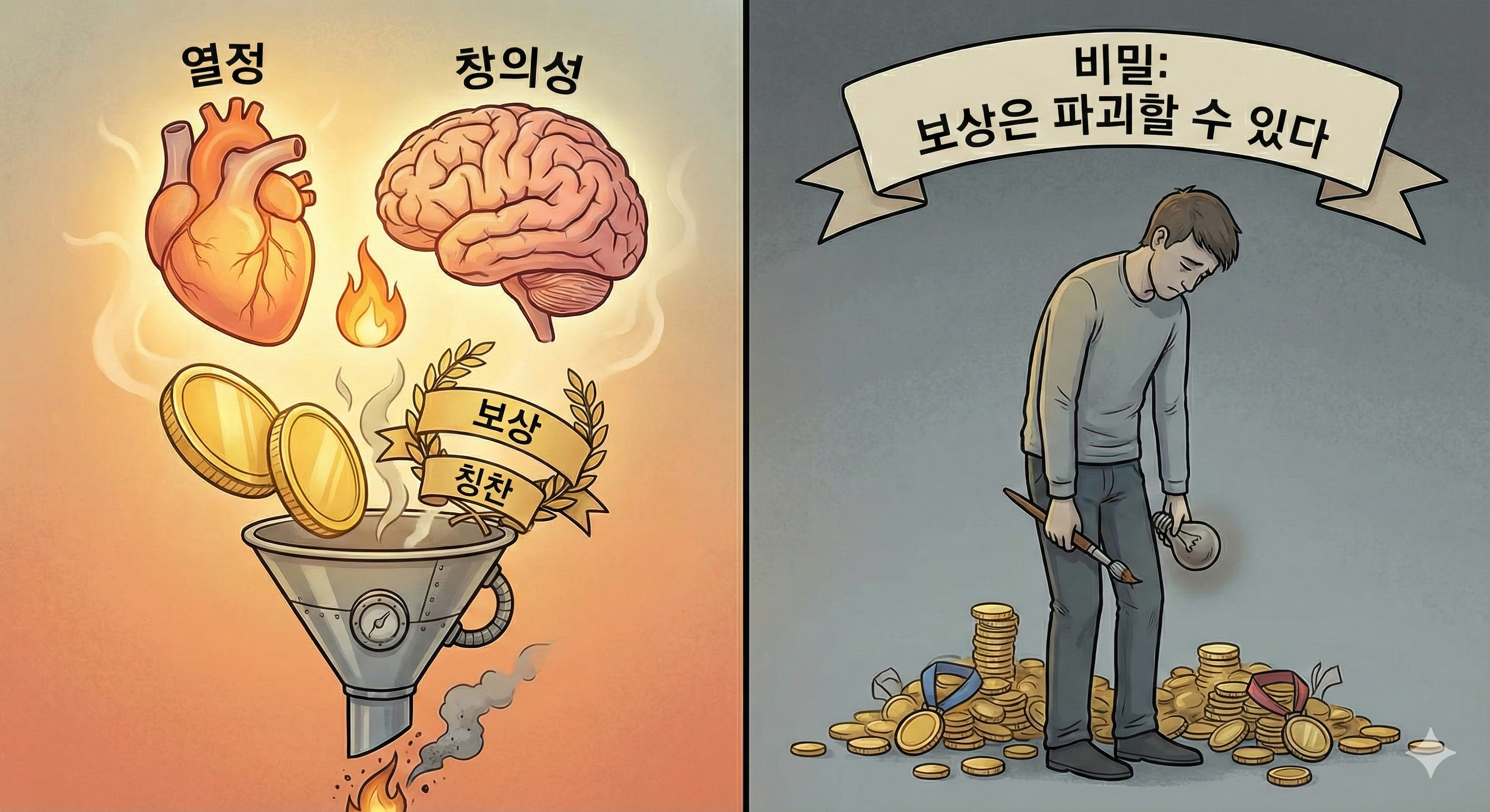 그렇다면 엔진은 어떻게 켜지는 걸까요? 연료는 무엇일까요? 우리는 앞으로 3편의 시리즈를 통해 마음의 엔진을 분해해 볼 것입니다. 이번 편에서는 보상의 역설을 다룹니다. 우리는 칭찬과 돈이 최고의 연료라고 믿습니다. 하지만 때로는 보상이 열정을 파괴하기도 합니다. 그 충격적인 비밀을 밝힙니다.