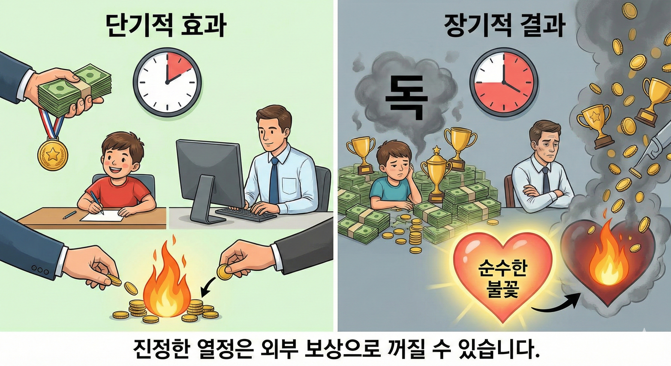 이 우화는 동기 심리학의 핵심을 찌릅니다. 아이들은 처음에 축구가 재밌어서 놀았습니다. 내적 동기의 발현입니다. 그런데 노인이 돈을 주기 시작하자, 축구는 돈을 벌기 위한 수단, 즉 외적 동기로 변질되었습니다. 돈이 사라지자 행동할 이유도 사라졌습니다. 순수했던 즐거움이 보상에 의해 밀려난 것입니다. 이것을 심리학에서는 과잉 정당화 효과(Overjustification Effect)라고 부릅니다. 내면의 동기만으로도 충분한 행동에 불필요하게 과도한 외적 보상(돈, 상, 칭찬)을 주면 오히려 흥미가 떨어지는 현상입니다.