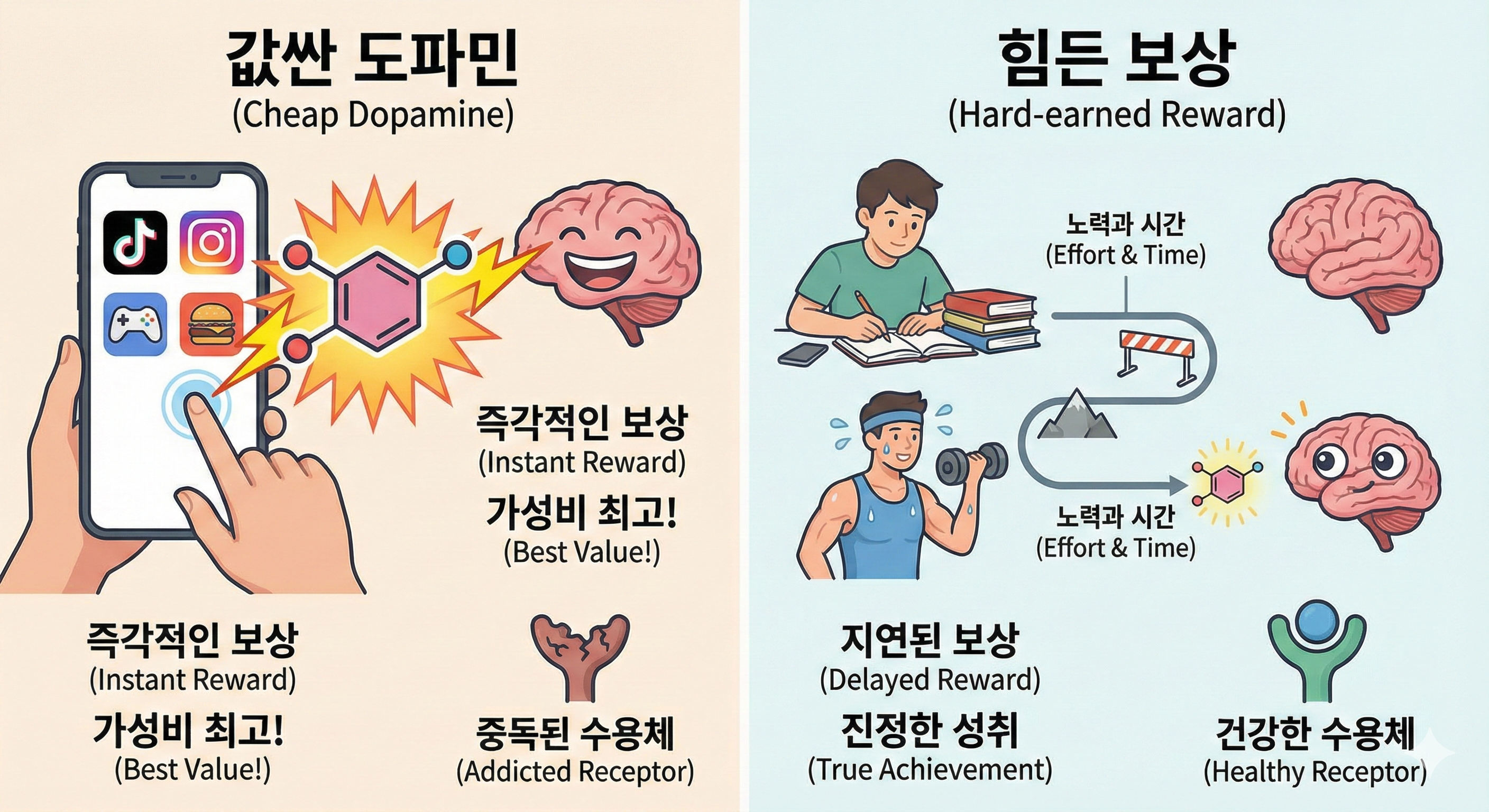 그런데 왜 우리는 공부나 운동은 시작하기 힘든 데 스마트폰은 1초 만에 켤까요? 그것은 값싼 도파민때문입니다. SNS, 쇼츠 영상, 게임, 자극적인 음식들은 노력 없이도 즉각적인 도파민을 줍니다. 뇌 입장에서는 가성비가 너무 좋은 보상입니다. 여기에 중독되면 뇌의 도파민 수용체는 망가집니다.