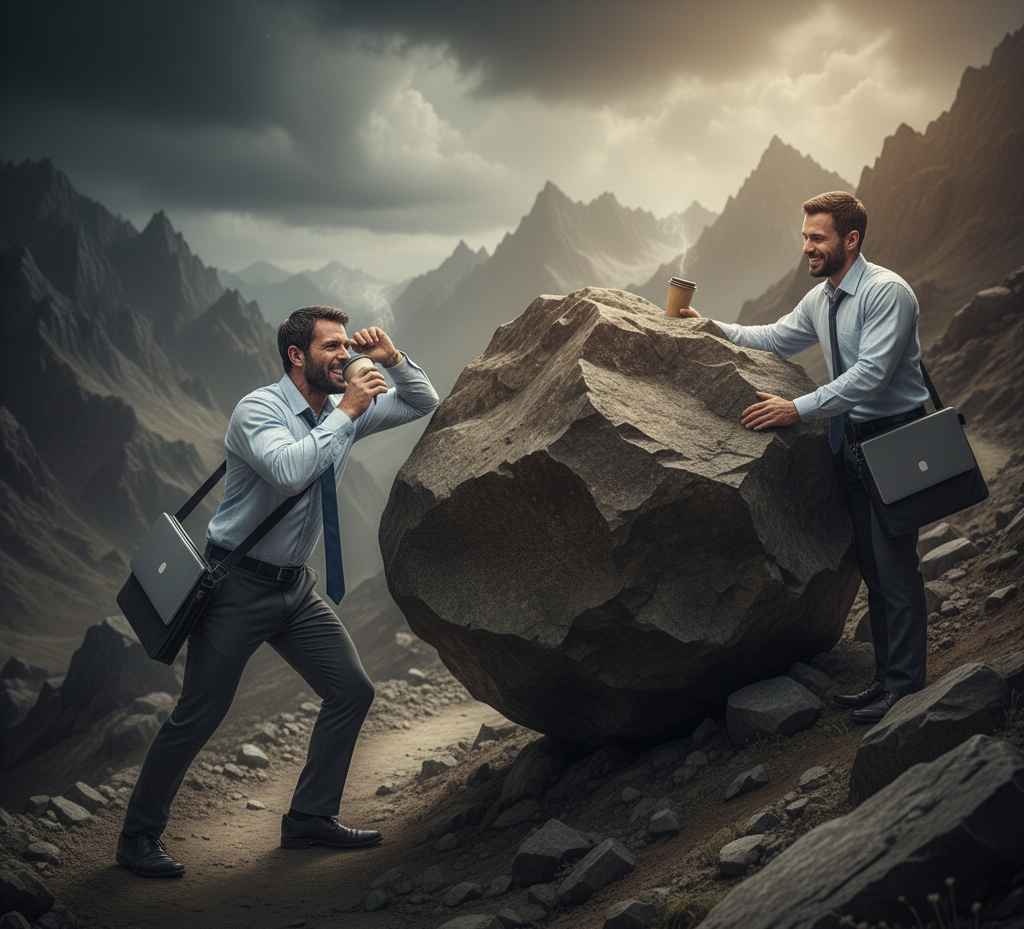 ‘시지프의 신화’는 고대 신화 속 이야기가 아니다. 오늘을 살아가는 우리 모두의 이야기다. 매일 아침 눈을 뜨면 같은 지하철, 같은 사무실, 같은 컴퓨터 앞에 앉는다. 프로젝트 하나를 끝내도, 또 다른 프로젝트가 기다리고 있다. 어쩌면 현대의 직장인들은, ‘시지프’보다 더 무거운 바위를 밀고 있는지도 모른다. 성과, 상사의 기대, 사회적 비교, 산꼭대기에 도달할 것 같지만 이내 다시 굴러떨어지는 현실. 그럼에도 우리는 다시 일어나 변함없이 하루를 시작한다. 왜일까? 바위를 밀어 올리는 그 순간에도, 우리는 동료를 위로하며, 커피 한 잔의 여유를 즐긴다. 삶은 늘 마음 같지 않지만, 그 안에는 소소한 행복이 있다. 카뮈가 말한 ‘시지프’의 미소는 바로 이런 순간들에 깃들어 있다.