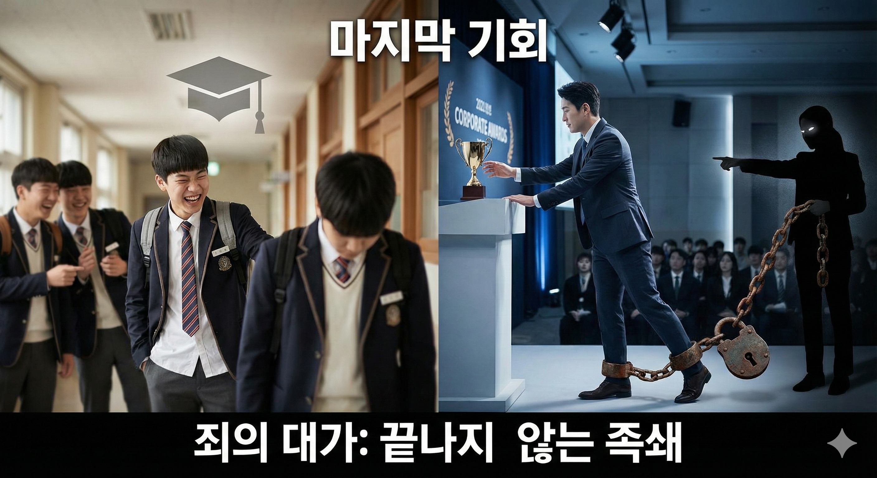 지금 이 순간에도 친구를 괴롭히며 낄낄거리는 당신에게 경고합니다. 당신이 누리는 그 알량한 권력은 졸업식과 동시에 끝납니다. 하지만 당신이 저지른 죄의 대가는 졸업 후에 엄청난 고통으로 돌아옵니다. 피해자는 당신의 얼굴, 목소리, 비웃던 표정 하나하나를 죽을 때까지 기억합니다. 당신이 사회에서 성공하려고 하는 그 결정적인 순간, 피해자는 당신의 발목을 잡을 가장 강력한 족쇄가 되어 나타날 것입니다.
