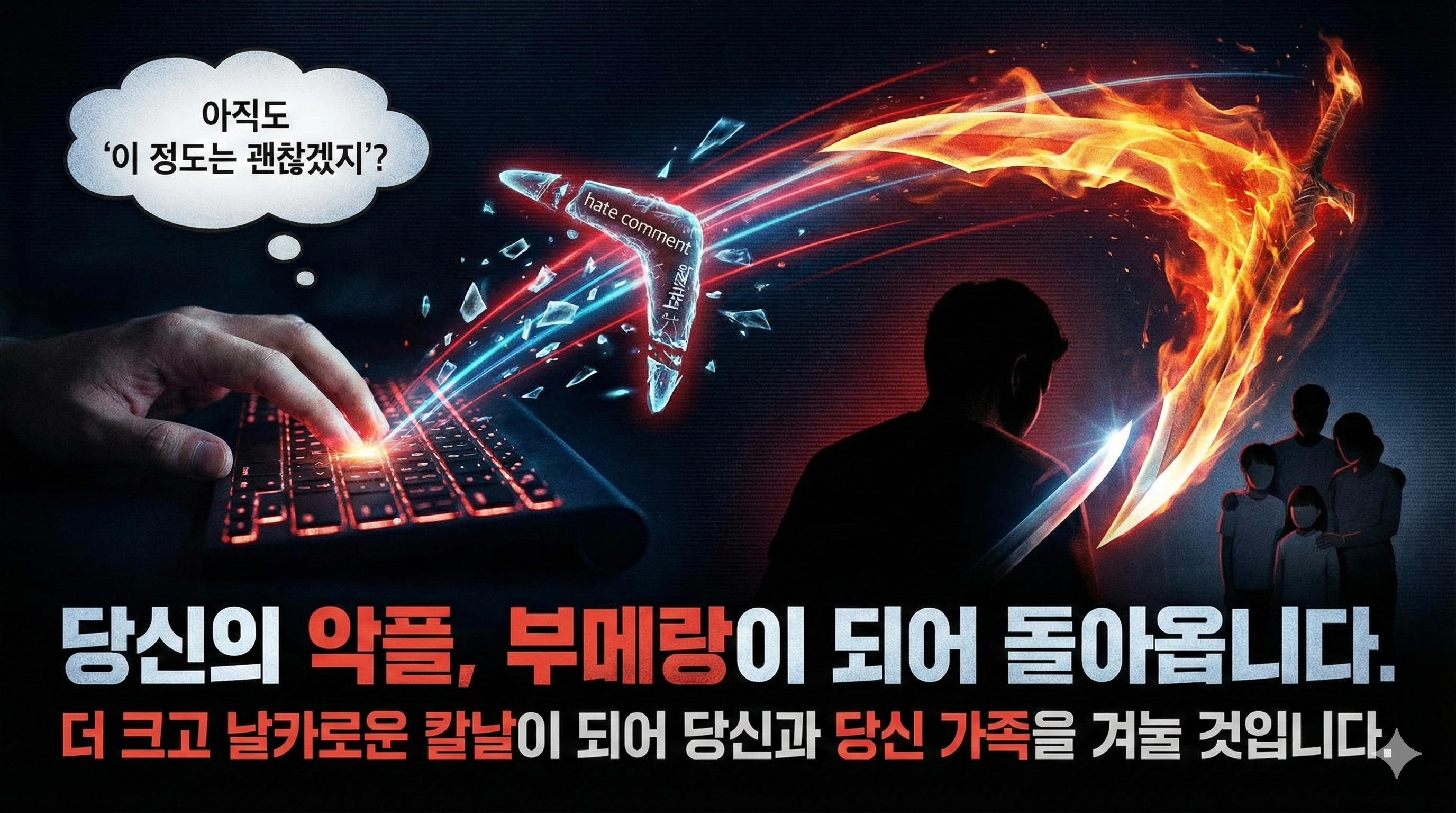 아직도 이 정도는 괜찮겠지 라는 생각으로 키보드 위에 손을 올리고 있습니까? 당신이 쓴 글은 부메랑이 됩니다. 반드시 돌아옵니다. 더 크고 날카로운 칼날이 되어 당신과 당신 가족의 목을 겨눌 것입니다.