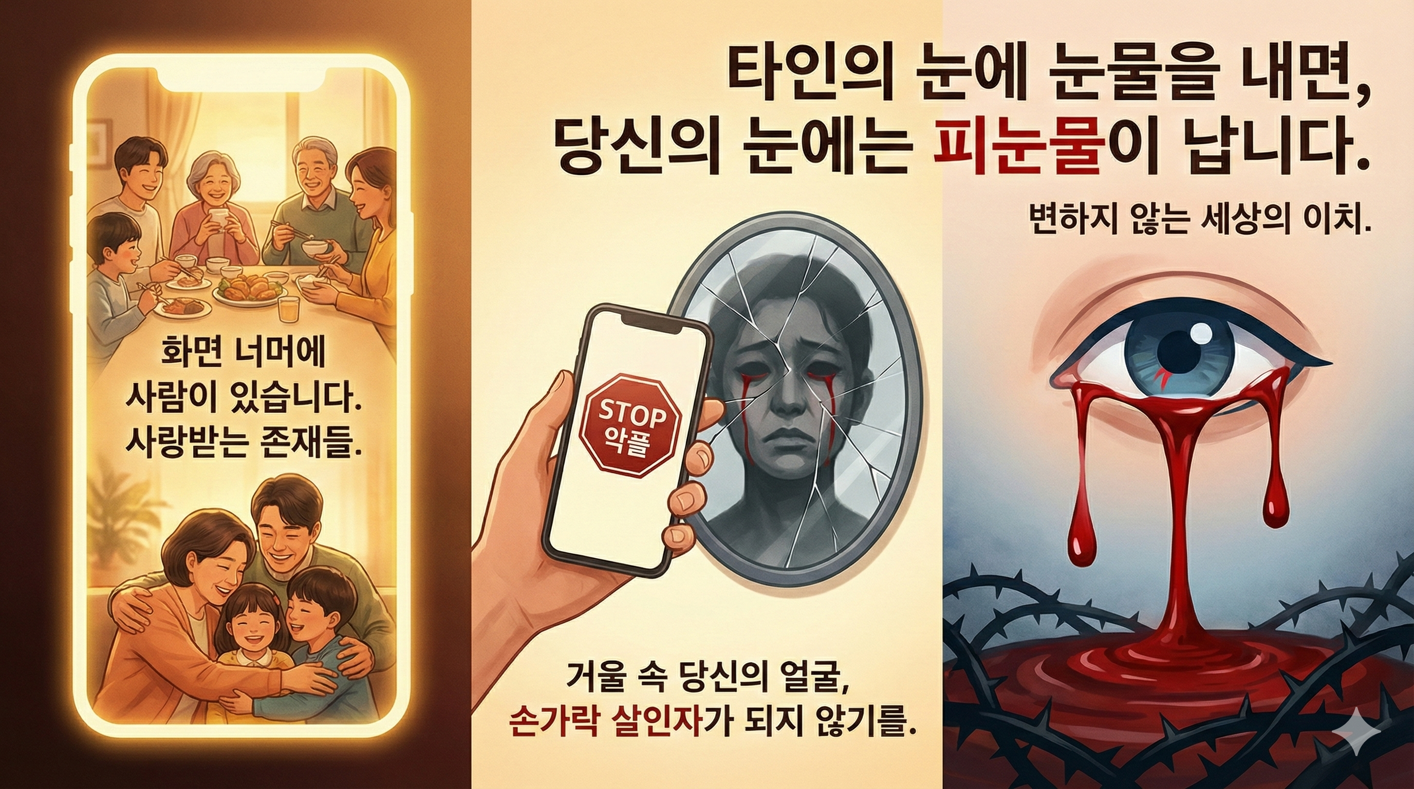 스마트폰을 보되 악플은 하지 마십시오. 거울도 보십시오. 거기에 비친 얼굴이 손가락 살인자의 얼굴이 되지 않기를 바랍니다. 오래된 속담에 이런 말이 있습니다. 타인의 눈에 눈물을 내면 당신의 눈에는 피눈물이 납니다. 이것은 변하지 않는 세상의 이치입니다.