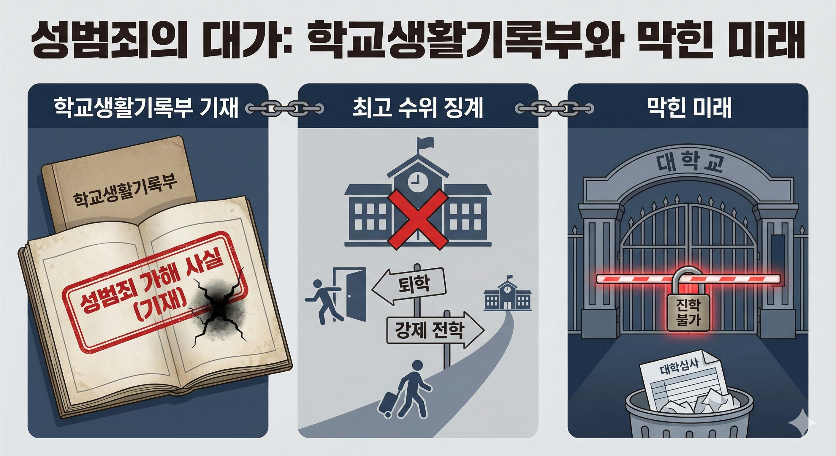 성범죄는 학교생활기록부에 기재되고 대부분의 학생은 퇴학조치 됩니다. 성범죄는 가장 심각한 학교폭력입니다. 강제 전학이나 퇴학 처분이 내려집니다. 생활기록부에 성범죄 가해 사실이 영원히 남아 대학 진학은 사실상 불가능해집니다.