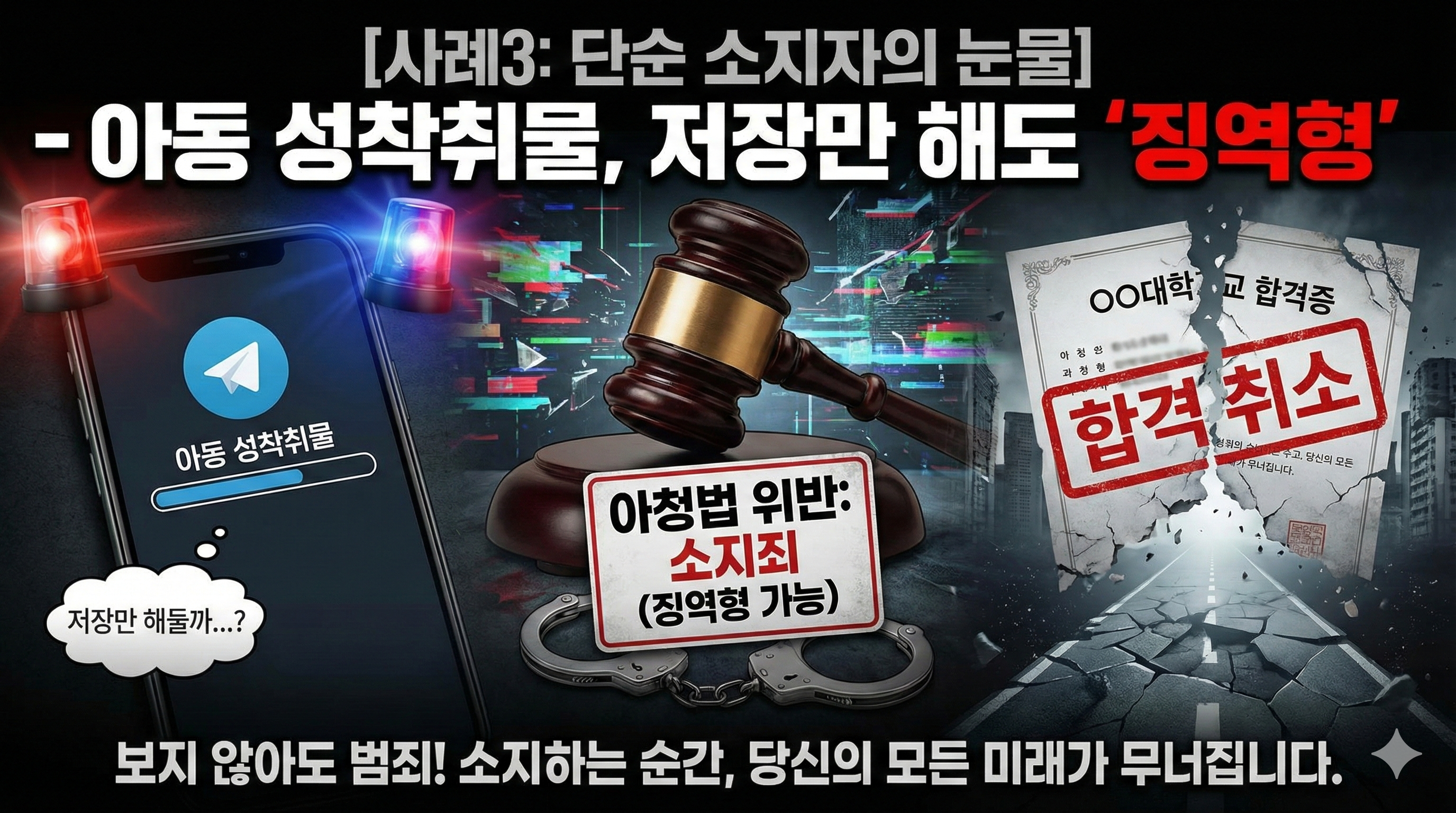 [사례 3: 단순 소지자의 눈물] 18세 C군은 텔레그램 방에서 아동 성착취 영상을 다운로드하여 저장만 했습니다. 보지도 않고 저장만 해두었다가 경찰에 적발되었습니다. 결과는 아청법 위반 소지죄입니다. 아동 성범죄 영상은 소지하는 것 만으로도 징역형이 가능합니다. C군은 전과자가 되어 대학 합격이 취소될 위기에 처했습니다.