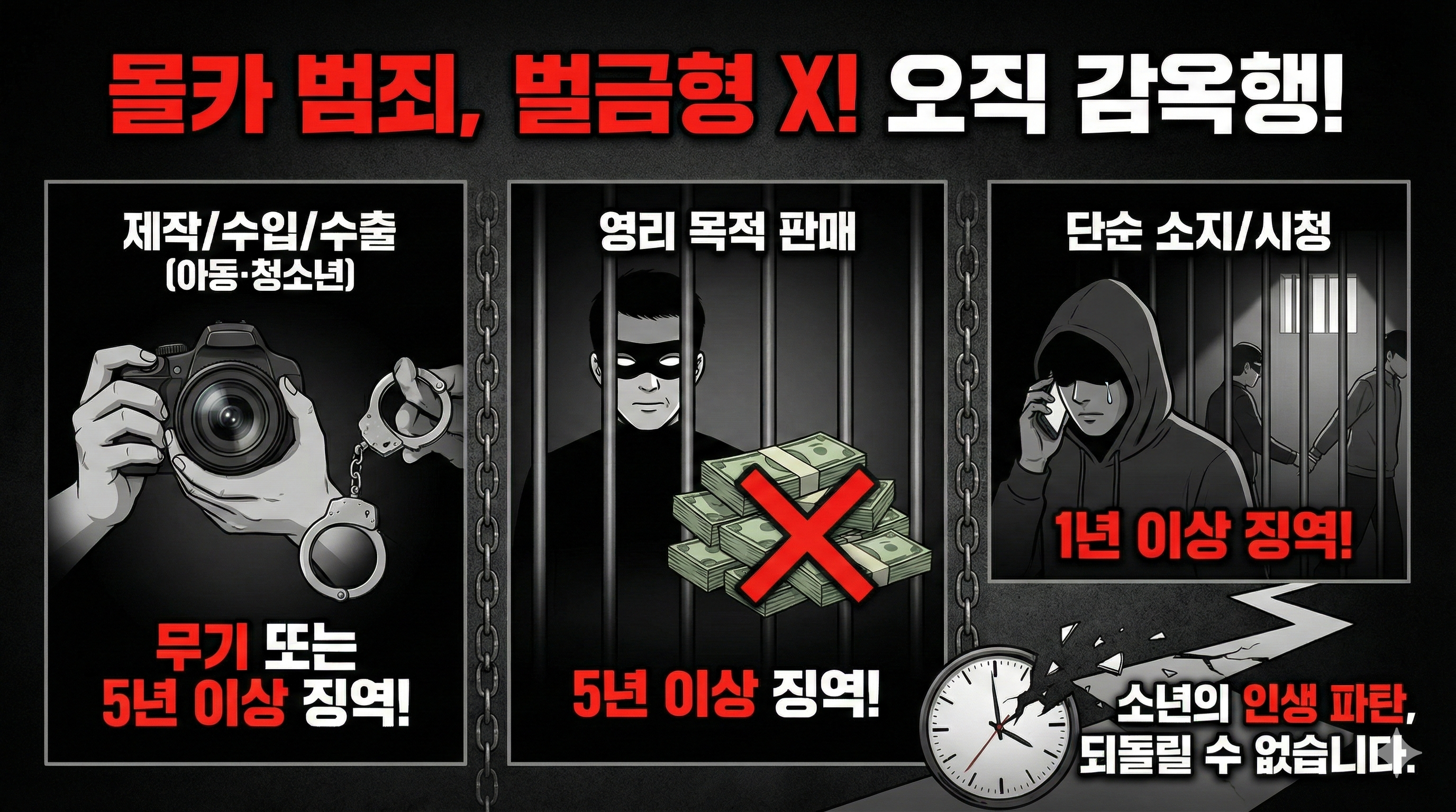 몰카 범죄는 강력하게 형사 처벌합니다. 벌금형이 없습니다. 아동·청소년 성착취물을 제작·수입·수출한 자는 무기징역 또는 5년 이상의 징역입니다. 영리 목적으로 판매하면 5년 이상의 징역입니다. 단순 소지나 시청도 1년 이상의 징역입니다. 벌금 내고 끝낼 수가 없는 범죄입니다. 감옥행인 것이죠. 소년의 인생에 심각한 영향을 미칩니다.