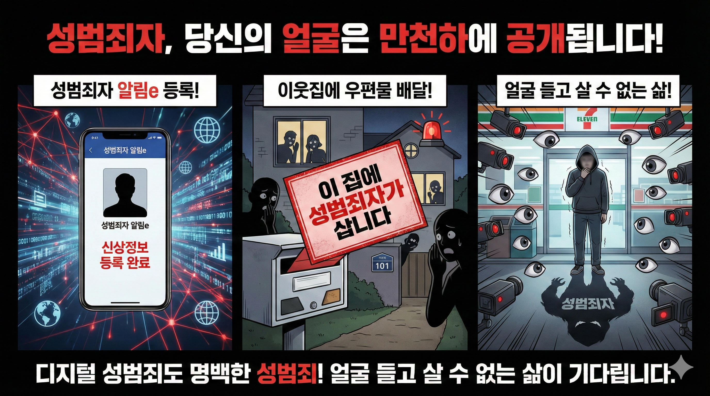 범죄자는 신상정보를 등록하고 공개될 수도 있습니다. 디지털 성범죄도 성범죄입니다. 여러분의 이름과 얼굴이 「성범죄자 알림e」에 등록될 수 있습니다. 이웃집에는「이 집에 성범죄자가 삽니다」라는 우편물이 배달됩니다. 이렇게 되면 얼굴 들고 편의점 가기도 쉽지 않습니다. 모든 사람들이 자신을 쳐다보는 것 같은 느낌을 가지게 됩니다.