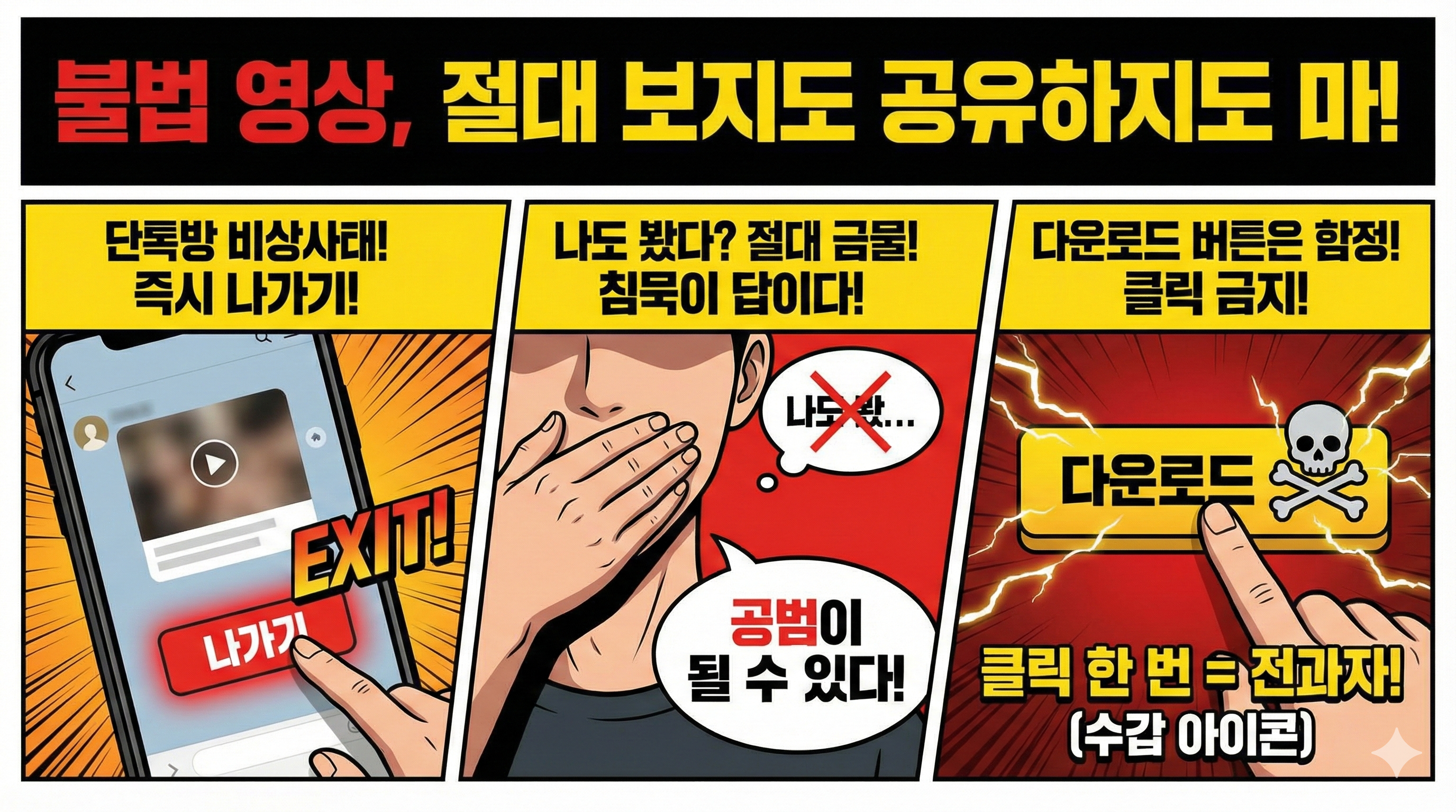 둘째, 불법 영상은 보지도 공유하지도 마십시오. 단톡방에 불법 영상이 올라오면 즉시 방을 나가십시오. 나도 봤다라고 말하는 순간 당신도 공범이 됩니다. 다운로드 버튼은 절대로 누르지 않아야 합니다. 당신의 클릭 한 번으로 전과자가 될 수 있습니다.