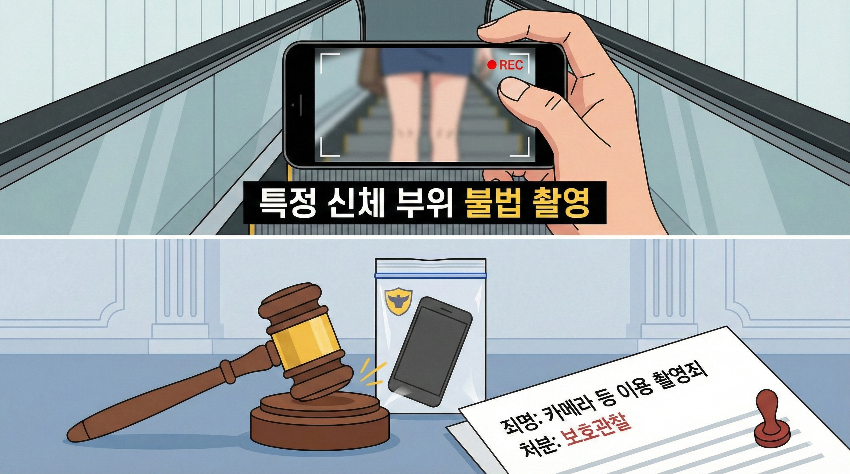 [사례 2: 에스컬레이터의 카메라] 15세 B군은 지하철 에스컬레이터에서 앞서가는 여성의 다리를 몰래 찍었습니다. 얼굴은 안 찍었으니 괜찮다라고 생각했습니다. 결과는 어떻게 되었을까요? 죄명은 카메라 등 이용 촬영죄입니다. 특정 신체 부위를 부각해 찍어 성적 욕망을 채우려 했음이 인정되었습니다. B군의 폰은 압수되었고 보호관찰 처분을 받았습니다.
