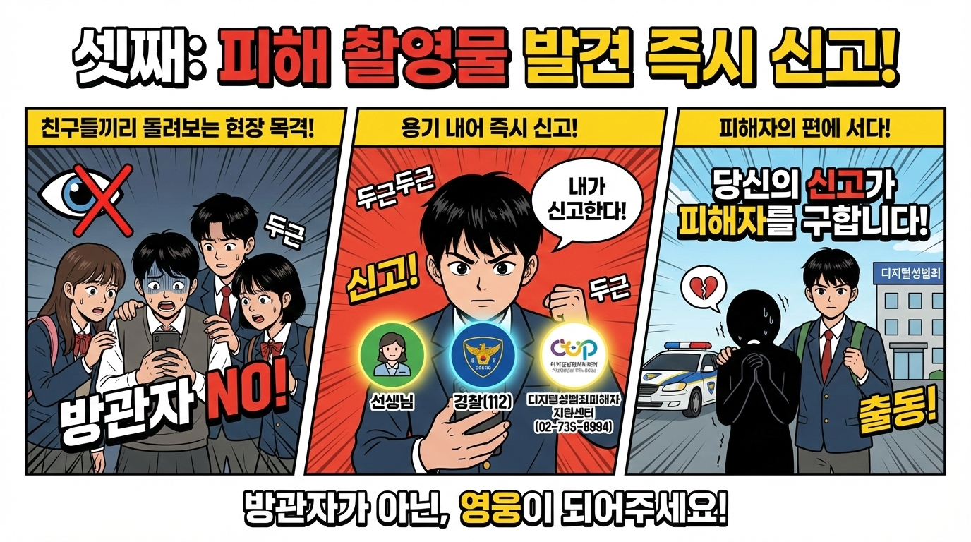 셋째, 피해 촬영물을 발견하면 즉시 신고해야 합니다. 친구들끼리 돌려보는 것을 목격했다면 선생님이나 경찰(112), 디지털성범죄피해자지원센터(02-735-8994)에 신고하십시오. 방관자가 되지 말고, 피해자의 편에 서야 합니다.