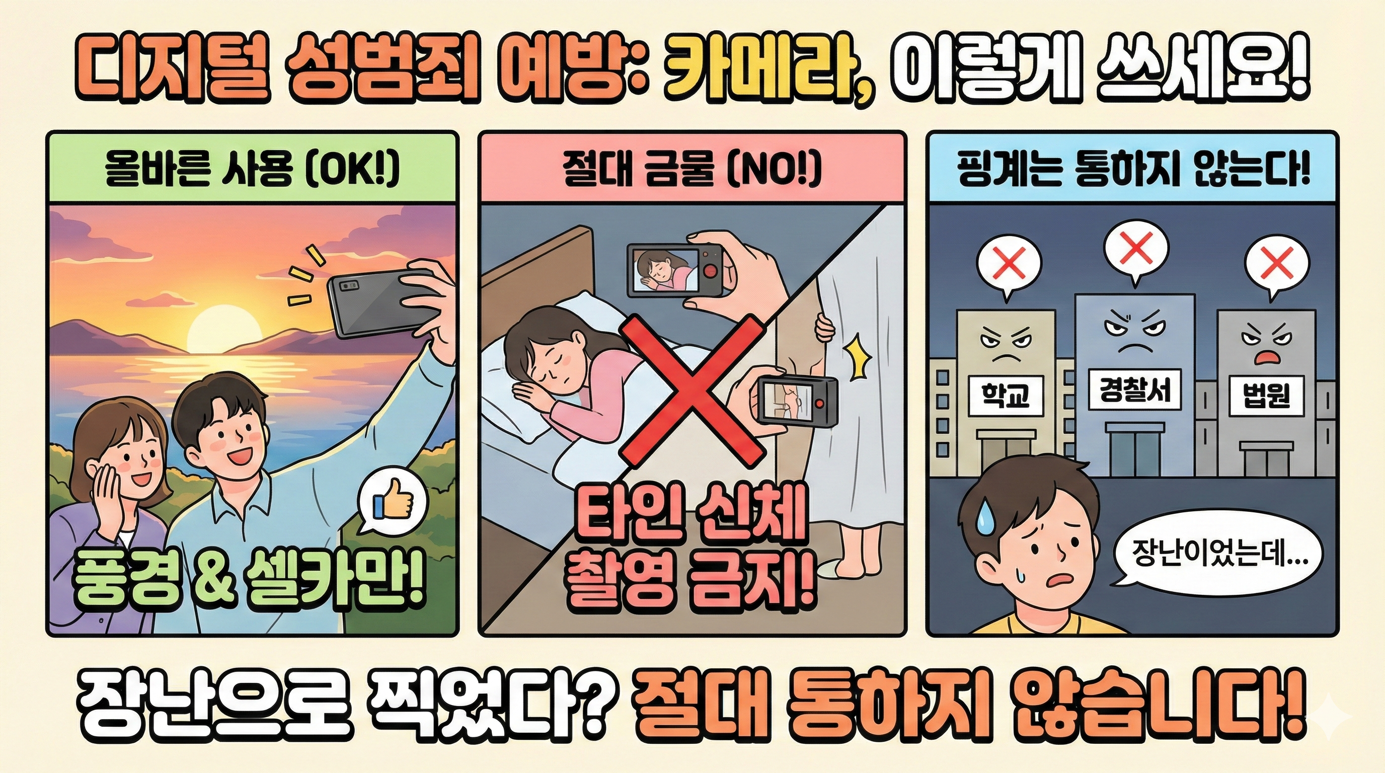 디지털 성범죄의 늪에 빠지지 않기 위해서는 다음과 같이 당장 실천하십시오. 첫째, 카메라는 풍경과 셀카에만 쓰십시오. 타인의 신체를 허락 없이 찍는 것은 절대 금물입니다. 잠든 친구, 옷을 갈아입는 친구 등 사생활 영역은 절대 촬영하지 마십시오. 장난으로 찍었다 라는 말은 학교, 경찰서, 법원 등 어디에서도 통하지 않습니다.