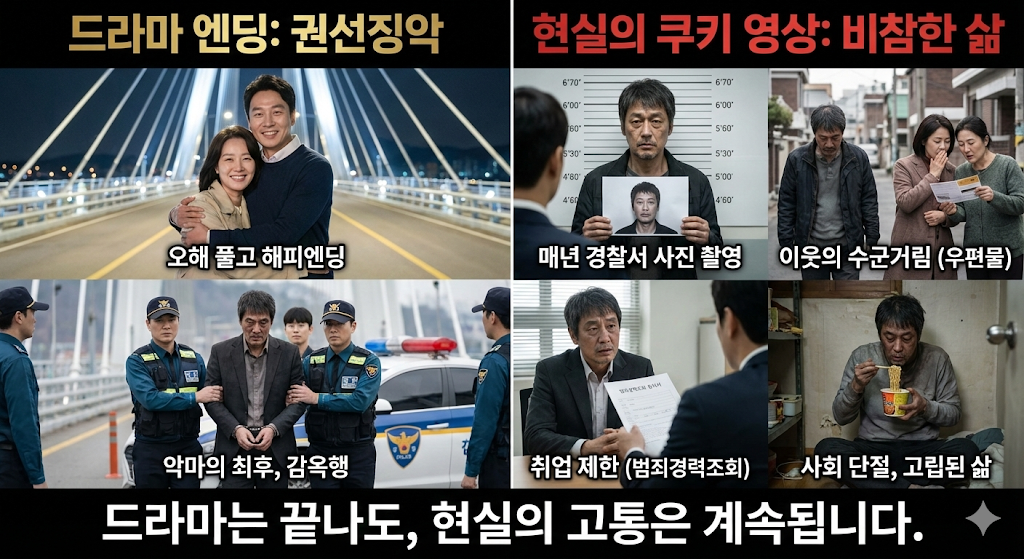드라마는 남녀 주인공이 오해를 풀거나, 악마가 감옥에 가는 것으로 끝납니다. 하지만 현실의 엔딩 크레딧 뒤에는 비참한 쿠키 영상이 이어집니다. 성추행범이 경찰차에 타고 연행이 됩니다. 대부분의 드라마는 권선징악의 틀을 유지하고 있습니다. 그는 벌금형을 받고 풀려났지만, 매년 경찰서에 가서 사진을 찍습니니다. 옆집 아주머니가 우편물을 보고 수군거립니다. 취직하려던 회사에서는 범죄 경력 조회를 동의해 달라고 합니다. 그는 결국 일용직을 전전하가나 소질도 없는 자영업을 하며 사회와 단절된 채 살아갑니다.