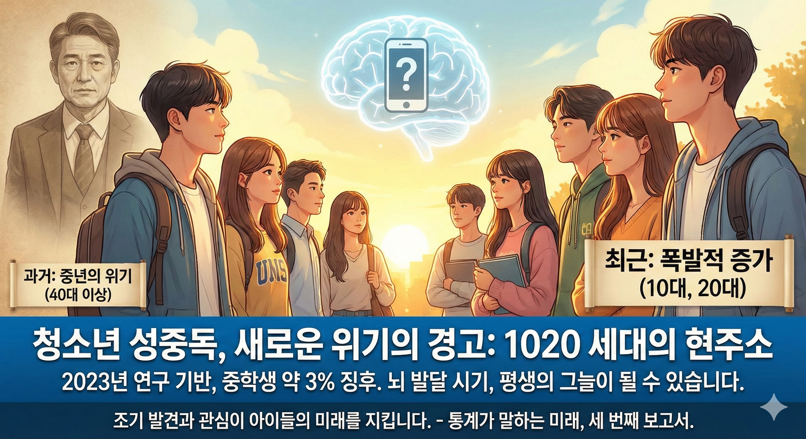 청소년기는 최근에 가장 우려되는 시기입니다. 2023년 국내 논문에 따르면, 중학생의 약 3%가 이미 강박적 성행동의 징후를 보이고 있습니다. 과거에는 40대 이상의 '중년의 위기'와 맞물리는 경우가 많았으나, 최근에는 10대와 20대에서 강박적 성행동 징후가 폭발적으로 나타나고 있습니다. 뇌가 발달하는 시기의 중독은 평생의 인지 왜곡을 초래할 가능성이 매우 높습니다.