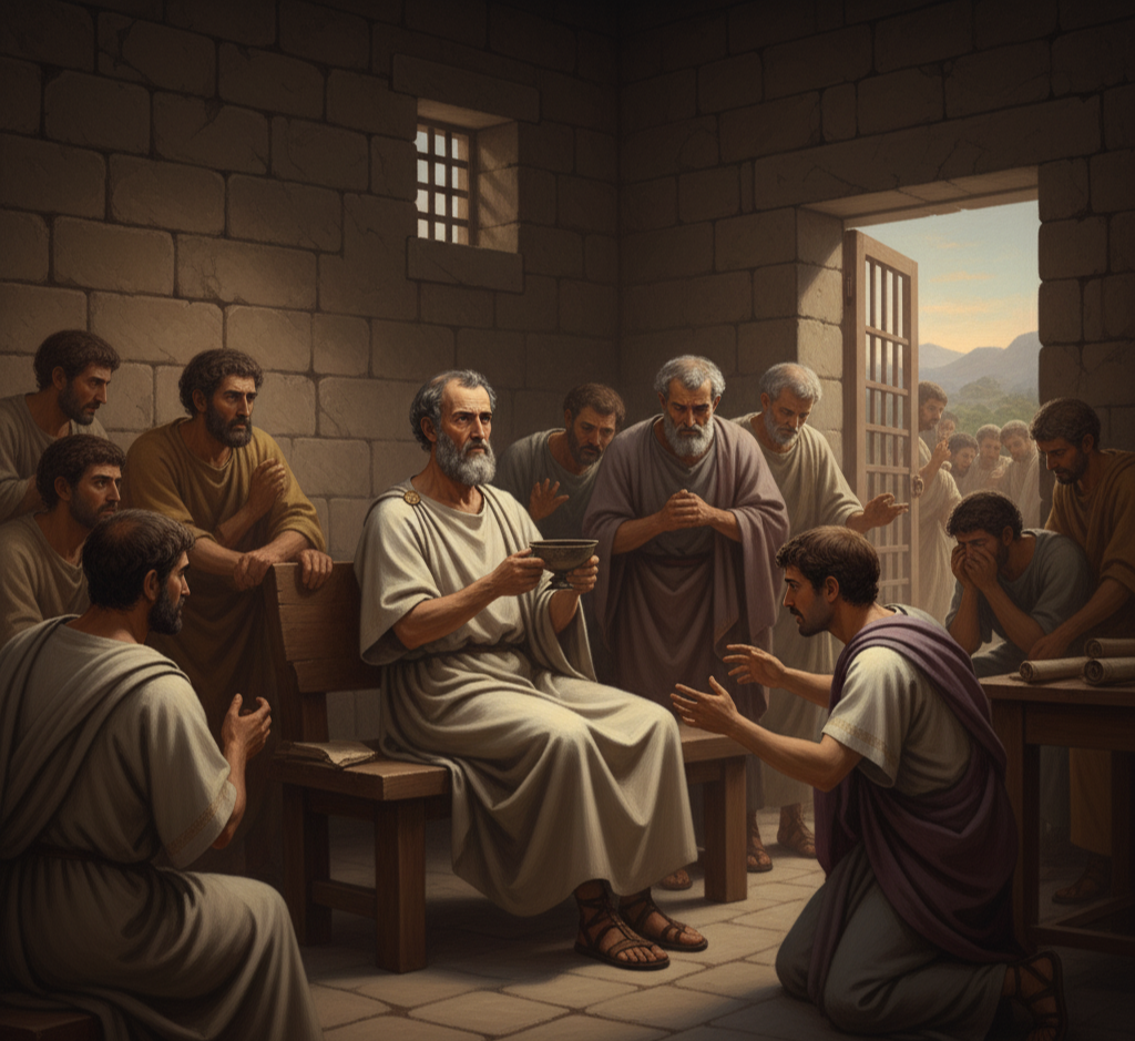 그는 기존의 신을 거부한 것이 아니라 더 도덕적이고 개인적인 방식으로 신을 이해했던 것이다. 그렇다면 그는 정말 죽음을 두려워하지 않았을까? 제자 플라톤의 기록에 따르면, 그는 죽음을 담담하게 받아들였고, 오히려 죽음 이후의 가능성을 철학적으로 탐구하려 했다. 『파이돈』에서 소크라테스는 육체로부터 해방된 영혼이 진리에 더 가까워질 수 있다고 말한다. 하지만 이 기록이 어디까지 사실인지는 명확하지 않다. 플라톤은 소크라테스를 존경한 제자였기에, 그의 담대함을 이상화했을 가능성도 있다. 그러나 소크라테스의 일관된 삶의 태도(자기 성찰, 진리 탐구, 양심에 따른 실천)를 볼 때, 죽음을 앞두고도 철학을 멈추지 않았다는 핵심 정신은 사실에 가까웠을 것이다. 이러한 태도는 오늘날에도 큰 울림을 준다.