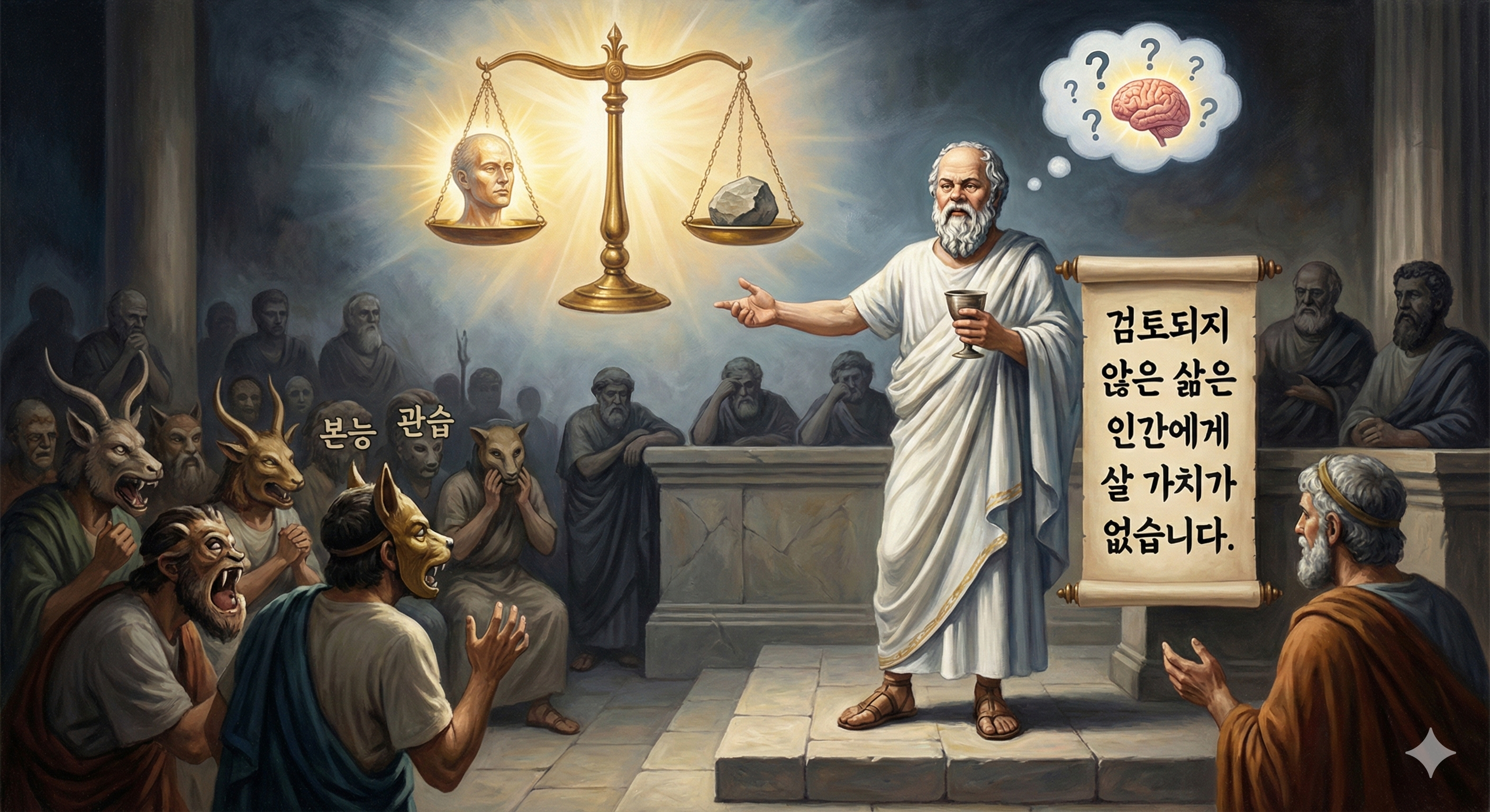 소크라테스의 모든 철학은 그의 마지막 순간 아테네 법정에서의 자기 변론에서 가장 극적으로 요약된다. 신을 부정하고 젊은이들을 타락시켰다는 죄목으로 고발당한 그는, 도망치거나 용서를 구하는 대신 자신의 철학적 삶이 얼마나 정당하고 필요한 것이었는지를 당당하게 역설했다. 그리고 마침내 이렇게 선언한다. 검토되지 않은 삶은 인간에게 살 가치가 없습니다. 이 말속에 그의 모든 것이 담겨 있다. 그에게 산다는 것은 단순히 숨 쉬고 먹고 잠자는 생물학적 과정이 아니 었다. 인간다운 삶이란, 매일 삶을 성찰하고, 무엇이 옳고 나쁜지, 무엇이 참되고 거짓인지를 끊임없이 묻고 검토하는 삶이다. 이러한 철학적 검토가 없는 삶은 그저 짐승처럼 본능과 관습에 따라 떠내려가는 삶일 뿐, 진정한 인간의 삶이라고 할 수 없다는 것이다.