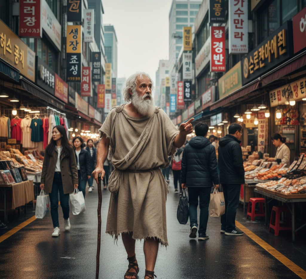 그들은 나를 아테네의 쇠파리라고 불렀다. 잠자는 말을 깨우는 성가신 벌레라는 뜻이었지. 결국 그들은 나에게 독배를 마시게 했다. 그런 내가 지금 너희의 시장 한가운데 서 있다. 여기는 시끄럽고, 빠르고, 번쩍인다. 사람들은 모두 손에 작은 판유리를 들고 그 안을 들여다보며 걷는다. 마치 신의 계시라도 받는 것처럼 말이다. 나는 너희를 판단하러 온 것이 아니다. 나는 아는 것이 없다. 다만 나는 궁금하다. 그래서 나는 너희에게도 똑같이 할 생각이다. 내가 아테네의 젊은이들에게 그랬던 것처럼 말이다. 그저 몇 가지 질문을 던질 뿐이다.