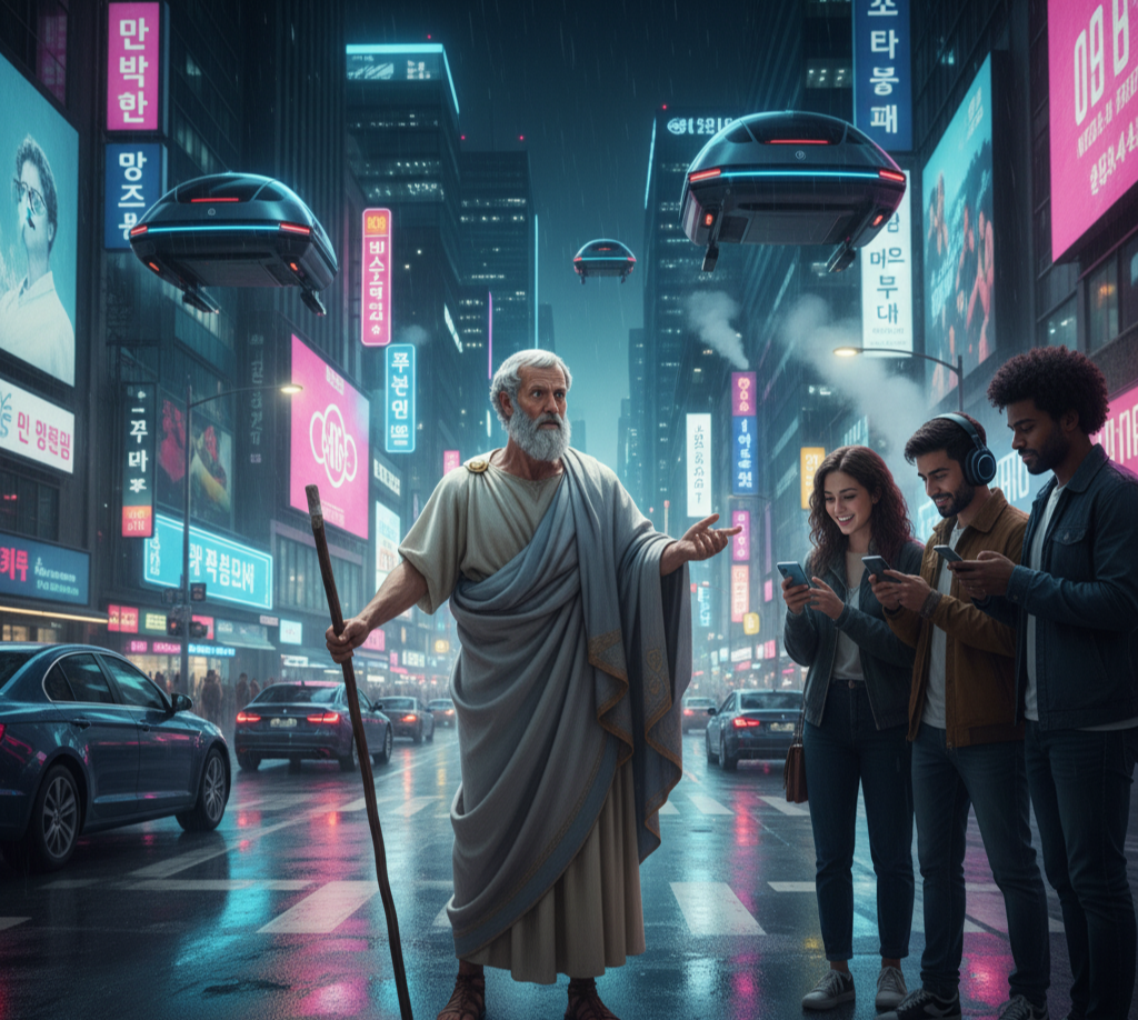 내 이름은 플라톤이다. 아테네의 아카데메이아에서 젊은이들과 진리를 논하던 내가 지금 여기에 있다. 어떻게 된 영문인지는 묻지 마라. 나도 모른다. 다만 나는 보고, 듣고, 생각한다. 이것이 2,400년 뒤의 세상이로구나. 너희들의 기술은 놀랍다. 손바닥만 한 판유리 조각(너희는 '스마트폰'이라 부르더군)으로 세상 끝과 소통한다. 밤에도 대낮처럼 빛나는 도시, 하늘을 나는 쇠로 만든 마차.