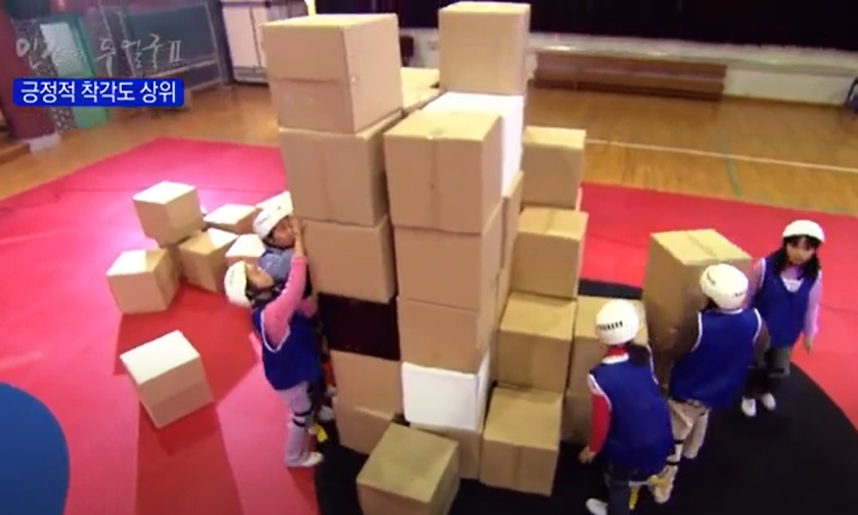 이번 실험은 어린이들의 종이상자 쌓기이다. 초등학생 4학년 150명을 대상으로 긍정적 착각도 설문조사를 하여 착각도가 가장 높은 학생과 평균 수준의 학생 각 5명을 선발한다. 실험은 각 팀이 2명씩 발을 묶고, 종이상자를 20분 안에 10층까지 쌓는 것이다. 긍정적 착각도가 높은 학생팀은 약속이나 한 듯 정확하고 신속하게 움직인다. 난관에 부딪혀도 힘을 모아 문제를 해결해 나간다. 발이 묶여 불편해도 먼저 움직인 친구에게 발을 맞추며 따라 간다. 주어진 시간을 2분 남겨두고, 탈을 쓴 출연자가 쌓아 놓은 상자들을 무너뜨린다. 하지만 긍정적인 아이들은 서로를 위로하며, 마지막 시간까지, 포기하지 않고 최선을 다한다. 그리고 결과에 만족하며 함께 참여하여 수고한 서로를 위로하고 칭찬한다.
