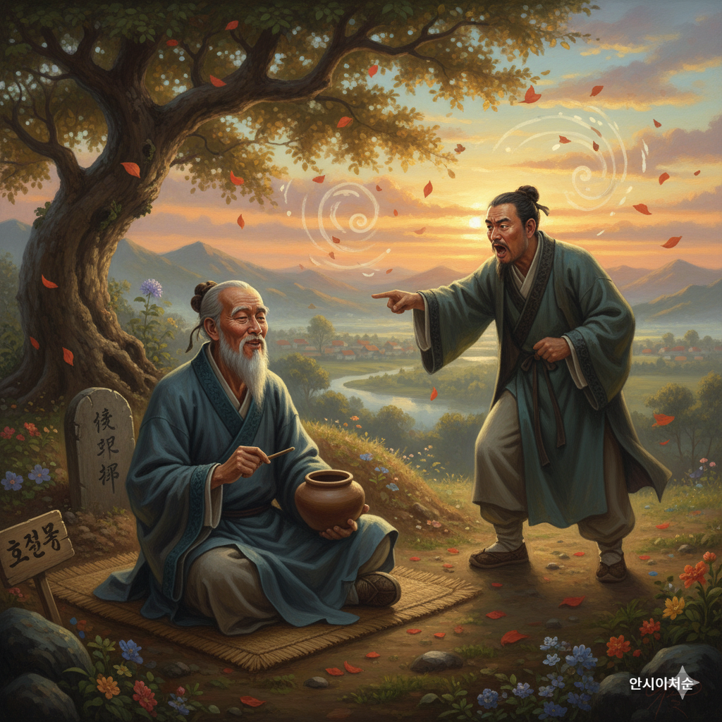그러자 장자는 태연하게 대답했다. "나라고 처음부터 슬프지 않았겠는가. 하지만 가만히 생각해 보니, 아내는 원래 형체도, 기운도, 생명도 없는 존재였네. 어쩌다 기운이 모여 생명이 되고 형체를 갖춰 태어났다가, 이제 다시 흩어져 본래의 자리로 돌아간 것뿐일세. 이는 봄, 여름, 가을, 겨울이 순환하는 것과 같은 자연의 이치지. 지금 아내는 천지라는 거대한 방 안에서 편안하게 쉬고 있네. 그런데 내가 그 옆에서 엉엉 울고불고한다면 그건 천명을 모르는 짓이 아닌가. 그래서 곡을 그치고 노래를 부르는 것이네."