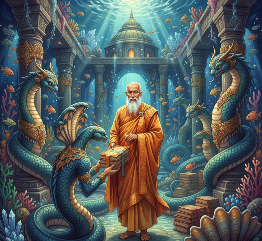 한 예언자로부터 젊은 나이에 요절할 운명이라는 말을 듣고, 이를 피하기 위해 출가하여 승려가 되었다. 불문에 귀의한 그는 불교의 모든 경전을 순식간에 통달했지만 그의 지적 갈증은 채워지지 않았다. 그는 세상에 알려진 모든 경전 너머에 붓다의 더 깊은 가르침이 있을 것이라 확신했다. 여기서 가장 극적인 전설이 등장한다. 나가르주나의 위대함을 알아본 거대한 용(나가)들이 그를 자신들의 세계인 용궁으로 초대했다. 그곳에는 인간 세상에는 전해지지 않은, 붓다가 특별히 용들에게 맡겨두었던 궁극의 경전들이 보관되어 있었다. 바로 반야바라밀다경(般若波羅蜜多經),즉 완전한 지혜의 경전들이었다. 나가르주나는 용궁에서 이 경전들을 모두 읽고, 깊은 뜻을 깨달았다. 그리고 그 지혜의 경전들을 가지고 인간 세상으로 돌아왔다. 이 전설은 그가 펼친 '공' 사상이 단지 그의 개인적인 창작이 아니라 붓다의 가장 심오한 가르침을 올바르게 복원한 것임을 상징적으로 보여준다. 용궁은 인간의 상식적인 사유가 미치지 못하는 깊은 지혜의 세계를 의미하며, 나가르주나는 그 심연으로 들어가 진리를 건져 올린 위대한 영웅으로 그려진다. 이 신화적인 권위 위에서, 그는 기존의 모든 불교 철학을 재검토하기 시작했다.